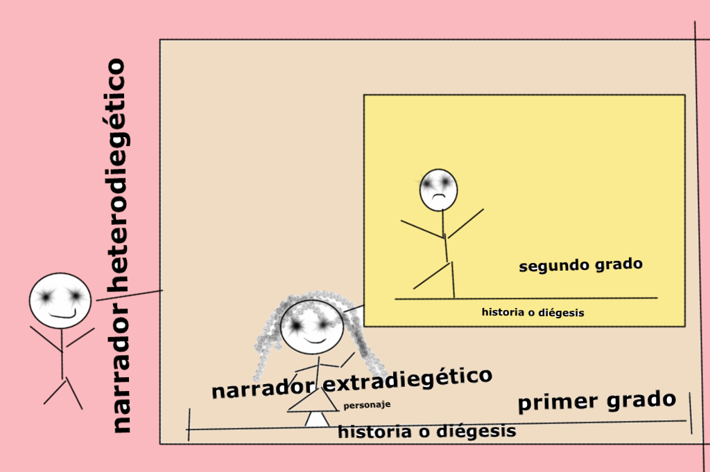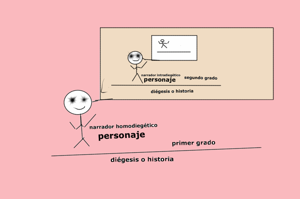 Ahora, si esta historia primaria genera una segunda historia en labios de un personaje, estaremos hablando de una historia en segundo grado que deberá tener otro narrador.  Según Genette, los narradores de las historias secundarias se clasificarán de la siguiente forma: si el personaje que se convierte en narrador de la segunda historia se narra a sí mismo en la acción de la segunda historia, será un narrador intradiegético (que está dentro de la segunda historia), por el contrario, si el personaje sólo refiere la historia de alguien más y no forma parte  del relato, será un narrador extradiegético (que no está en la segunda historia).